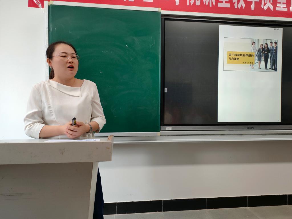 最后,物理教研室教师李渝以“科研项目申报的几点体会”为题,为新进教师们传授了科研项目申报的宝贵经验。她强调,科研项目申报需要保持积极态度,同时要做到“知己知彼”,明确研究方向和创新点;还为老师们分享了项目申报书撰写技巧,以提升项目申报的竞争力。李渝老师的分享为新进教师们今后的科研工作提供了有力的指导和支持。