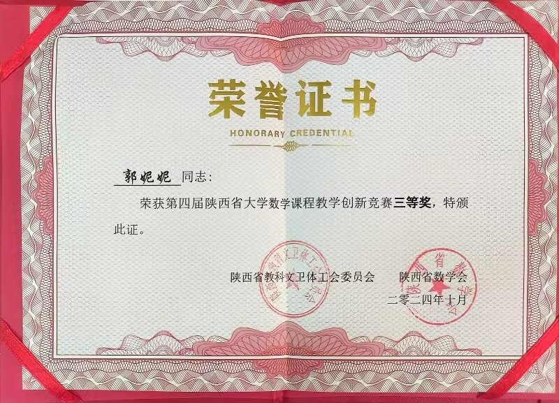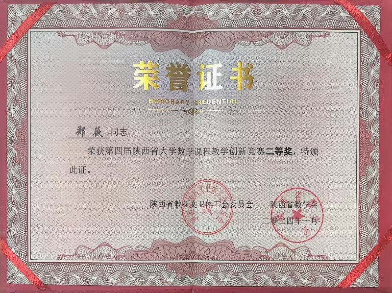 近日,第四届陕西省大学数学课程教学创新竞赛的获奖结果正式揭晓,本次竞赛由陕西省教科文卫体工会委员会和陕西省数学会主办,旨在促进各高校之间的教学交流与合作,推动数学课程的创新与改革。beat365通识教育学院郑薇老师荣获二等奖,郭妮妮老师荣获三等奖。