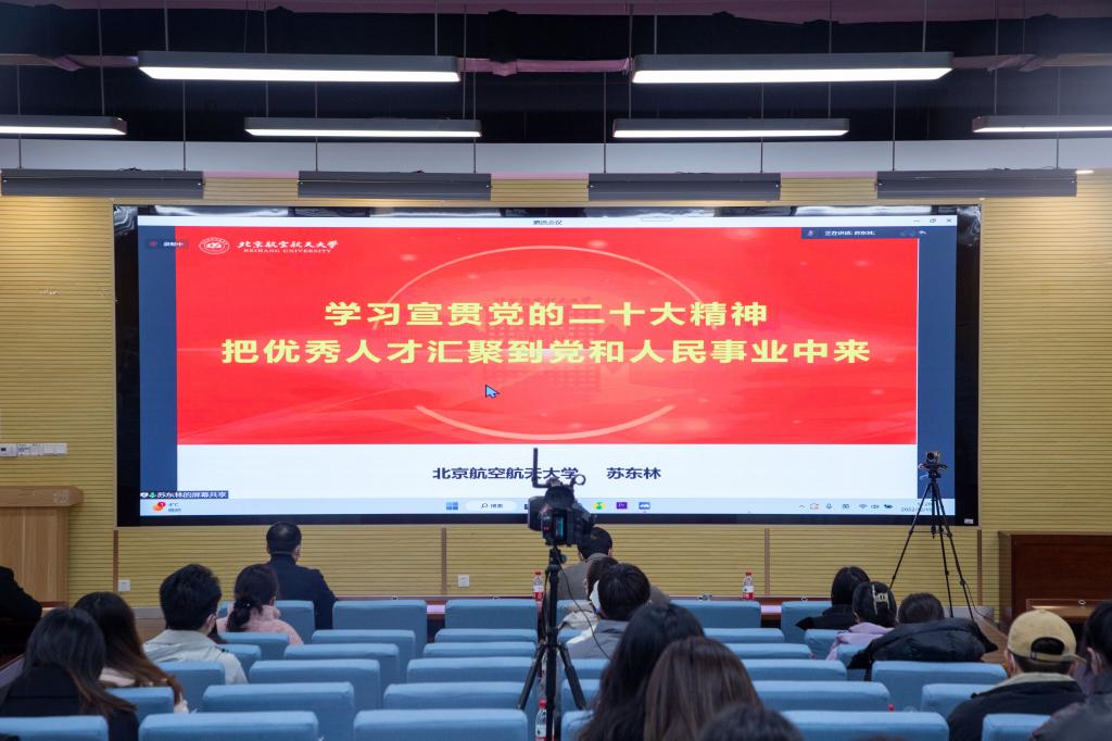 12月15日下午,学校特邀党的二十大代表、中国工程院院士、北京航空航天大学教授苏东林为师生作党的二十大精神宣讲报告。报告会在学校建德楼201报告厅以线上线下相结合的方式进行。校党委副书记董昊主持报告会。