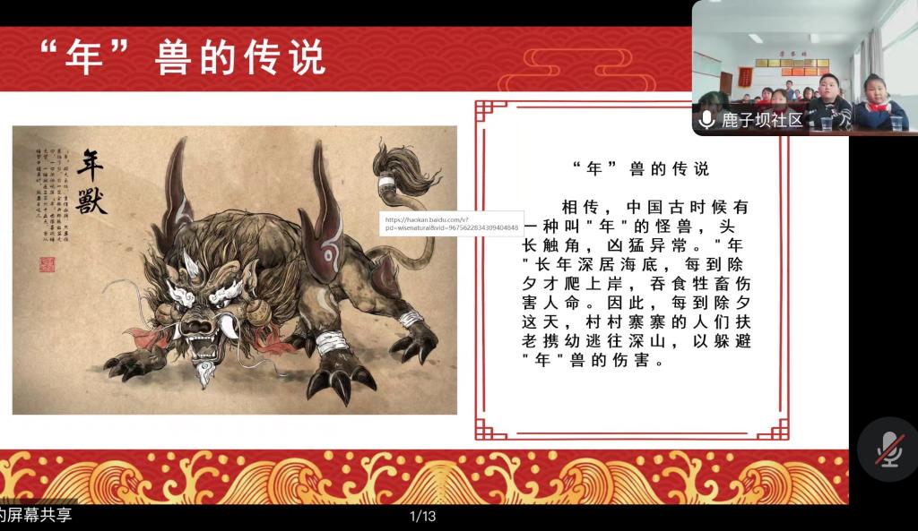 为教育引导鹿子坝社区的青少年儿童传承中华优秀传统文化,丰富课余知识,增强文化自信,学生第三党支部入党积极分子申京杰以四大传统节日之一的春节进行讲解,给孩子们分享了《“年”兽的传说》,讲解了春节的由来、春节的习俗、春节的礼仪和饮食等文化,让社区青少年对传统节日有了更为深刻的认识,吸引更多青少年了解、传承传统文化。