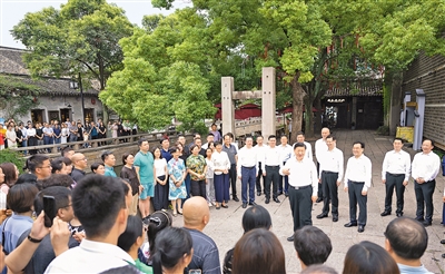 街边小广场上,曲乐悠扬,当地居民和游客正在欣赏苏州评弹表演。看到总书记来了,大家纷纷向总书记问好。习近平饶有兴致地同大家一起观看表演,他对大家说,昨天我看了工业园区,今天又看了传统文化街区,到处都是古迹、名胜、文化,生活在这里很有福气。苏州在传统与现代的结合上做得很好,不仅有历史文化传承,而且有高科技创新和高质量发展,代表未来的发展方向。他对当地负责同志讲,平江历史文化街区是传承弘扬中华优秀传统文化、加强社会主义精神文明建设的宝贵财富,要保护好、挖掘好、运用好,不仅要在物质形式上传承好,更要在心里传承好。