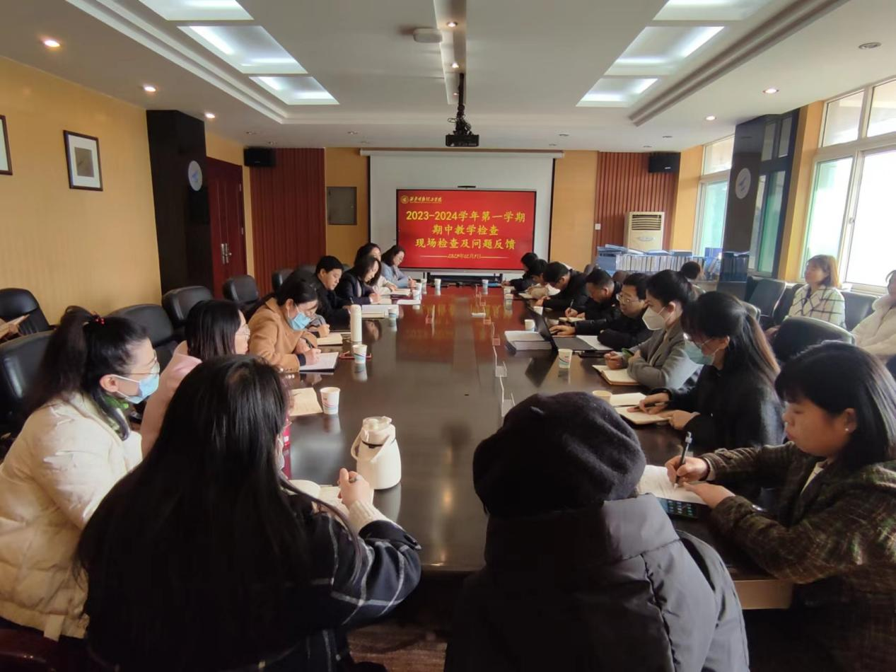 为全面了解本学期教学运行情况,夯实学校教学常规,全面提升beat365教学水平和人才培养质量,努力营造教师规范教学、严谨治学,学生勤奋好学、不断进取的良好氛围,高等职业技术学院于2023年12月5日在明理楼216会议室召开2023-2024学年第一学期期中教学检查现场检查及问题反馈会。联系校领导财务总监马晓军、教务处及相关部门出席了本次会议,高等职业技术学院领导、专业负责人、教学管理等相关人员参加了本次会议,会议由教务处副处长文亮主持。