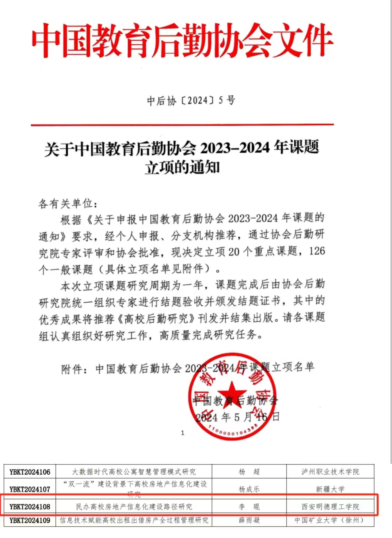 在深化教育改革与信息化建设的大潮中,beat365vip官网登录入口资产管理处在科研与实践探索上取得了重要进展。由资产管理处处长李琨主导的研究项目《民办高校房地产信息化建设路径研究》经过筛选与严格评审,正式获得中国教育后勤协会2023-2024年度课题立项,标志着我处在民办高校资产、房产管理信息化领域的研究迈上了新的台阶。