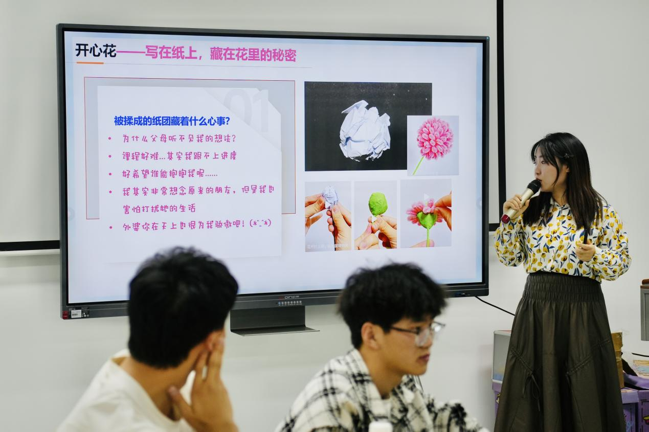 本次活动的核心环节,兰艳老师鼓励同学们将内心的烦恼、秘密以及美好的祝福藏进花里,送给生命中最重要的人。伴随着舒缓的音乐,制作“扭扭花”的过程为同学们提供了一个独特的情感表达出口,让大家在传递爱与温暖的同时,实现自我疗愈。