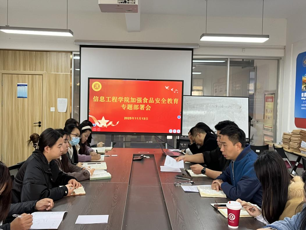 为深入落实学校关于加强校园食品安全工作的要求,结合秋冬季传染病多发季节特点,提高学生食品安全意识,筑牢校园食品安全防线,全面保障学生饮食健康安全。11月13日,信息工程学院召开“食品安全教育”专题部署会,全体辅导员参会,会议由学院党委副书记高长江主持。