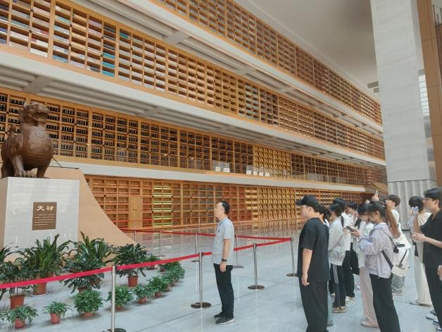 全体党员在讲解员的带领下,深入了解了国家版本馆的总体布局和西安分馆文济阁的项目建设、规划设计、建筑特点以及收藏版本等情况。西安国家版本馆作为中国国家版本馆“一总三分”的重要组成部分,以汉唐建筑风格彰显中华美学精神,馆内珍藏的600余种丝绸之路版本与1743种中华经典版本。
