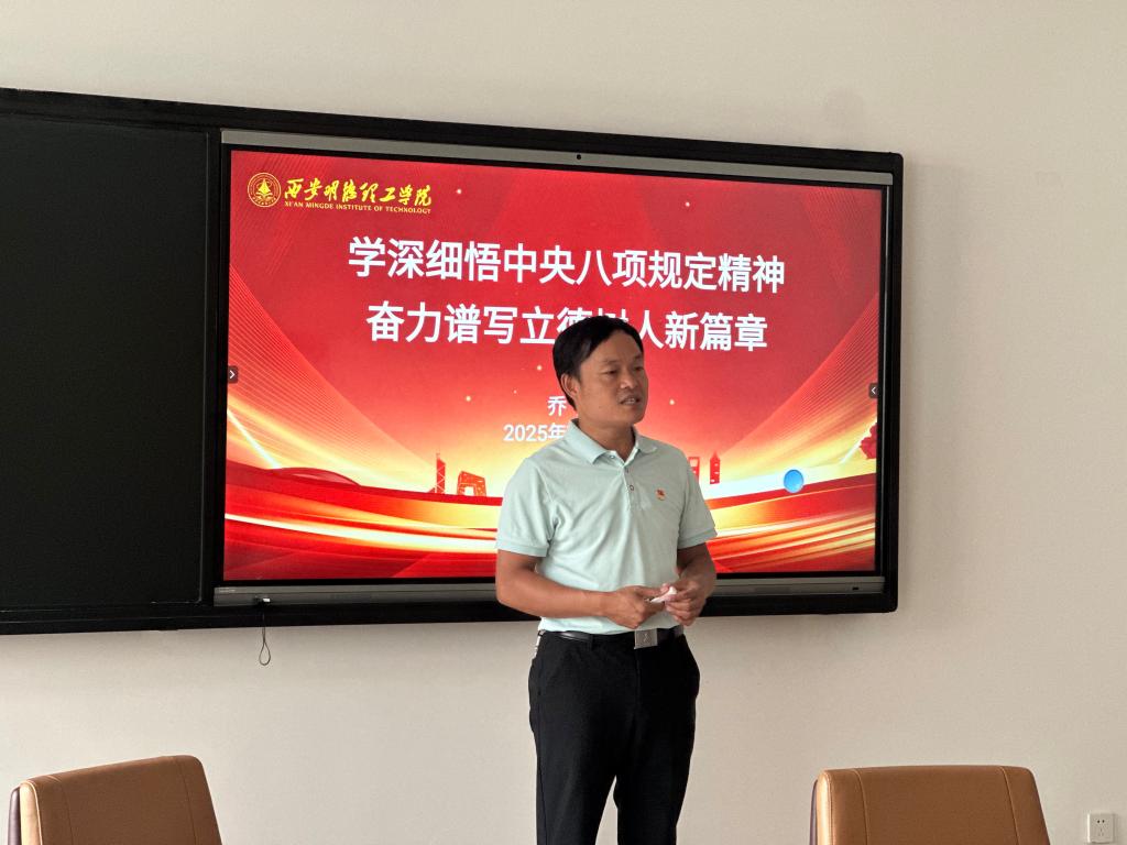 乔建同志带领全体教工党员重温中央八项规定精神出台背景与实践历程,强调开展此次学习教育对高校教师队伍建设的特殊意义。“作为艺术设计专业教师,我们的审美取向、行为作风会潜移默化影响学生的职业观与价值观。”他指出,落实中央八项规定精神不仅是党员的政治责任,更是教师“立德树人”的内在要求——唯有以严谨务实的教风、清正廉洁的作风为表率,才能引导学生在艺术创作中坚守正确导向,在职业生涯中秉持职业操守。